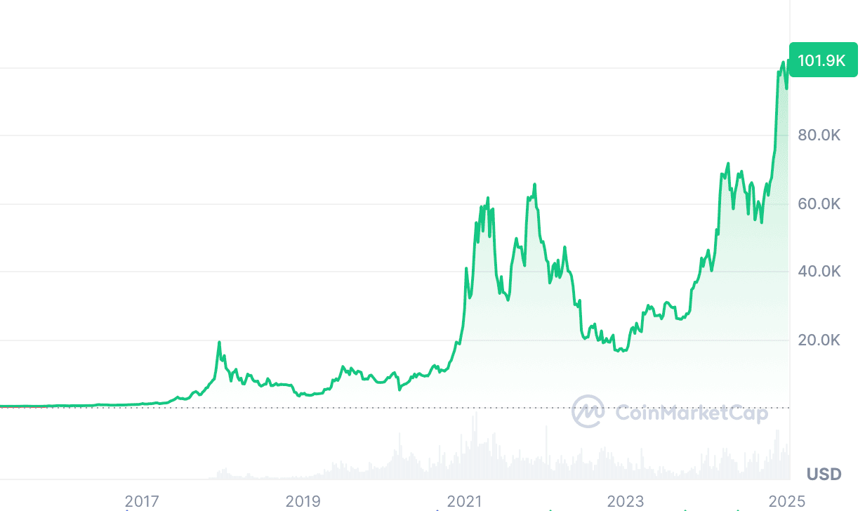 En 2025, le Bitcoin atteint un nouveau sommet historique de 100 000 $, consolidant sa place comme l’un des actifs les plus performants de l’histoire.